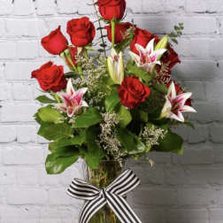 Price: $110.00Dozen Roses with Stargazer Lilies